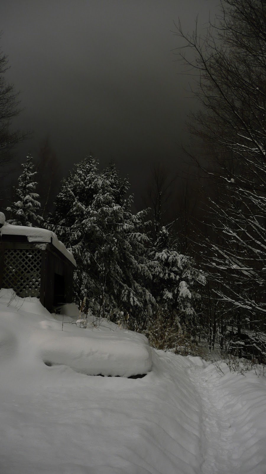 8 secondes de pose. La lumière (étrange !) ait dû à la réflexion de l'éclairage des pistes de ski sur les nuages, le tout en arrière de chez moi. Une pollution de plus à Bromont...mais ça rapporte des bidoux ! Donc on ferme sa gueule et on paie ses taxes.