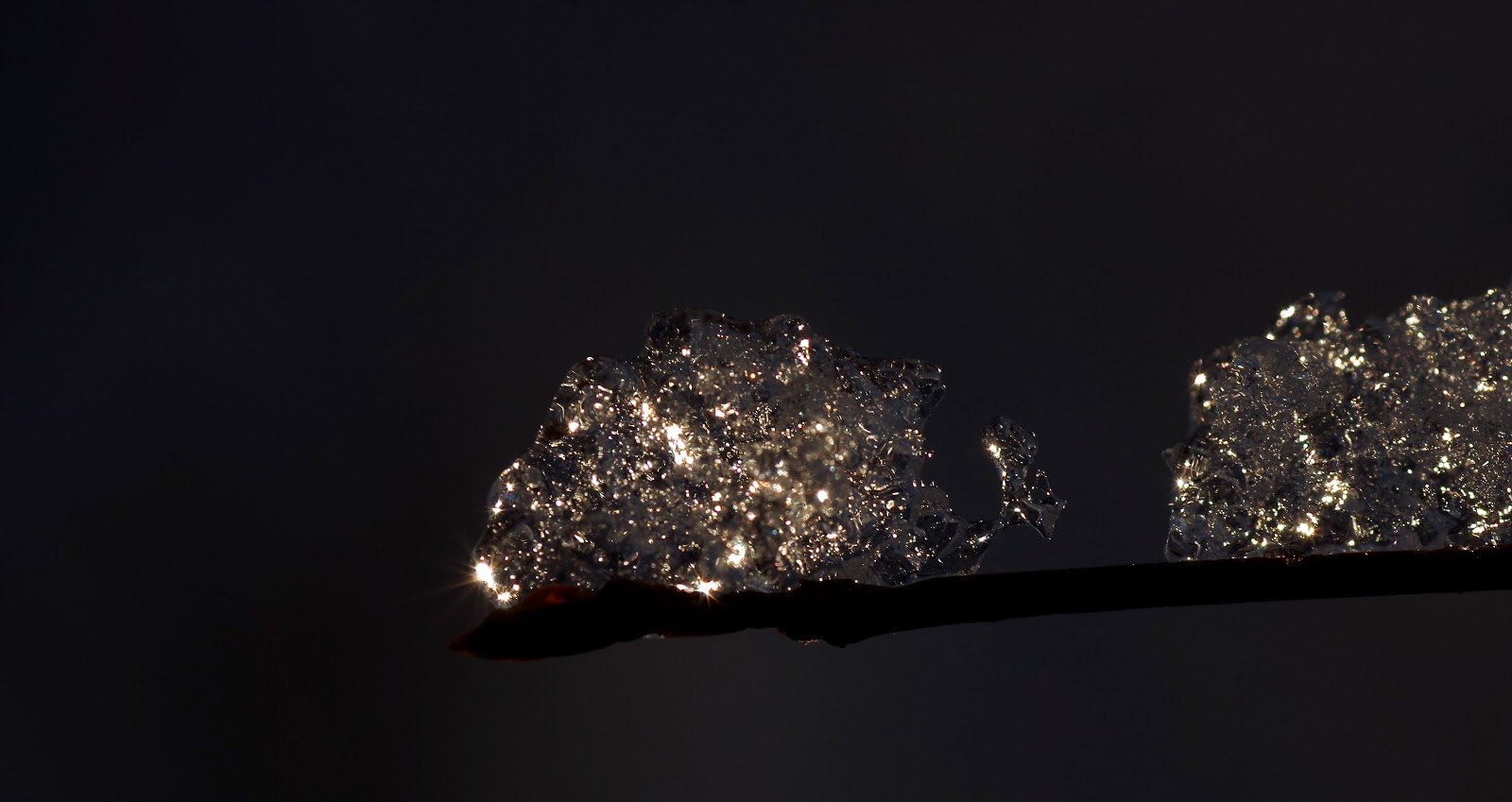 Neige devenue glace sur une brindille d'érable. Plusieurs essais en macro avec fond de plus en plus foncé.