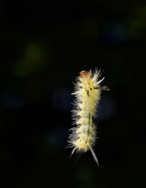 La danse du fil. Halysidota tessellaris. Halysidote du pommier se balançant dans le vent. 2cm à peine.